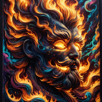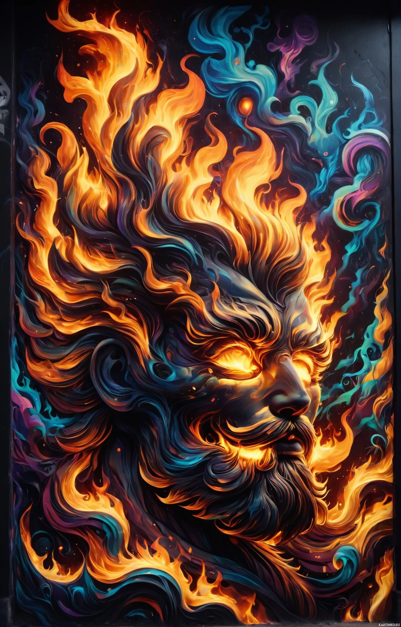 facial tattoos that resemble flames. The background depicts fiery elements swirling around his head, suggesting a theme of fire or possibly inferno. The overall style of the image is highly stylized and dramatic, potentially indicative of a certain subculture or