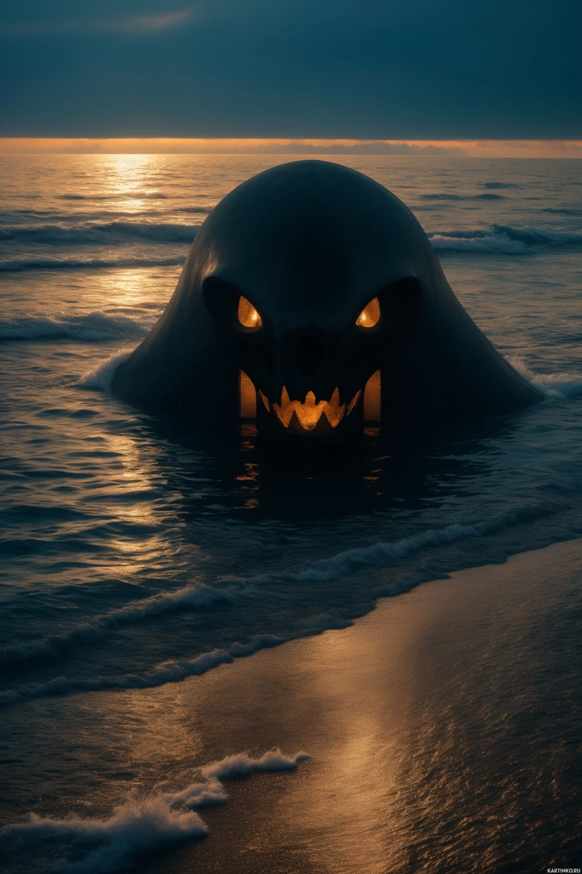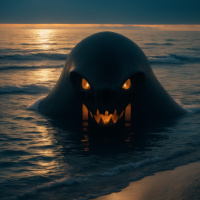 beach scene at sunset. In the foreground, there is an unusual sight—a large creature with tentacles and an intimidating expression, resembling a monster from a fantasy or