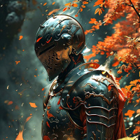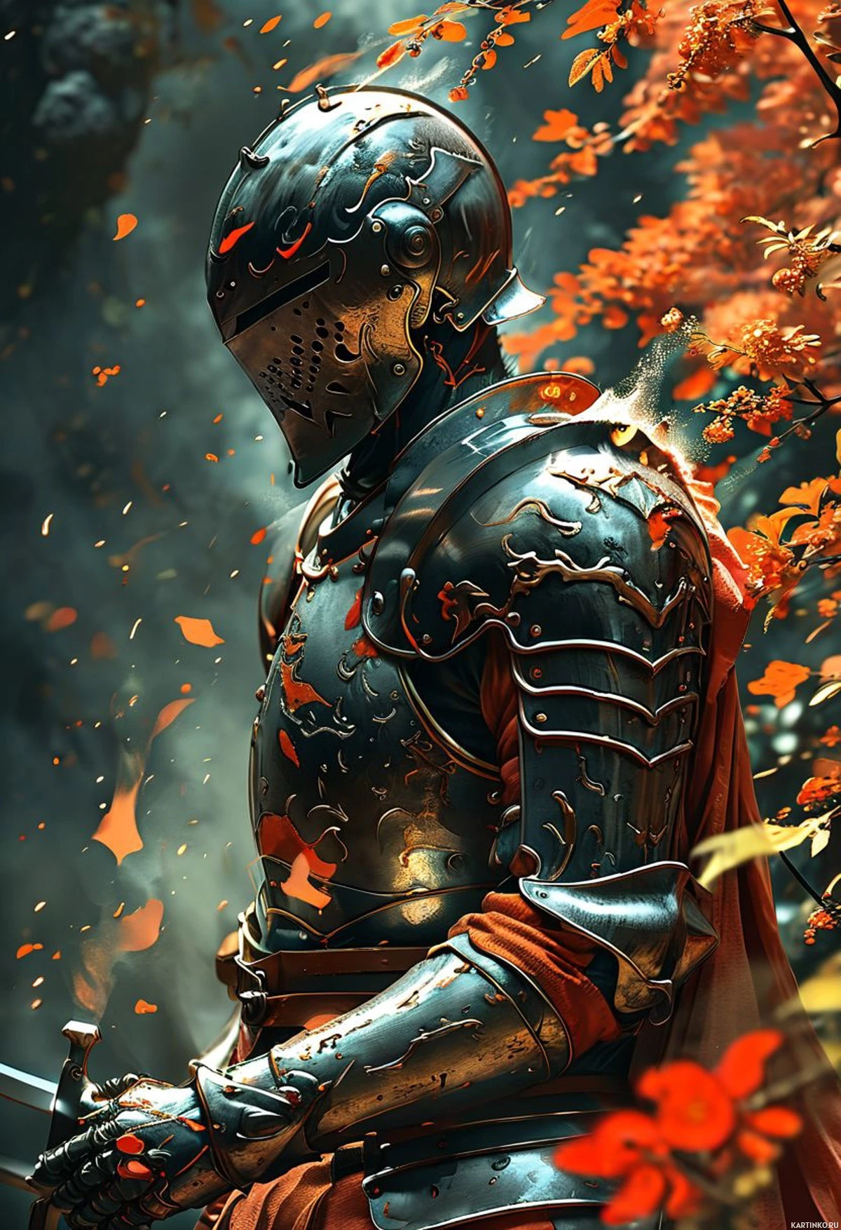 the dramatic effect. Behind the figure, there are autumnal leaves in shades of red and orange, which fall gently around the character, creating a sense of seasonality and perhaps symbolizing the passage of time or the end of a campaign. The artwork is rich in detail and color, with textures that give the armor and the leaves a three-dimensional appearance. It's a dynamic piece that captures the essence of historical warriors through vivid storytelling.