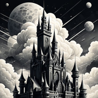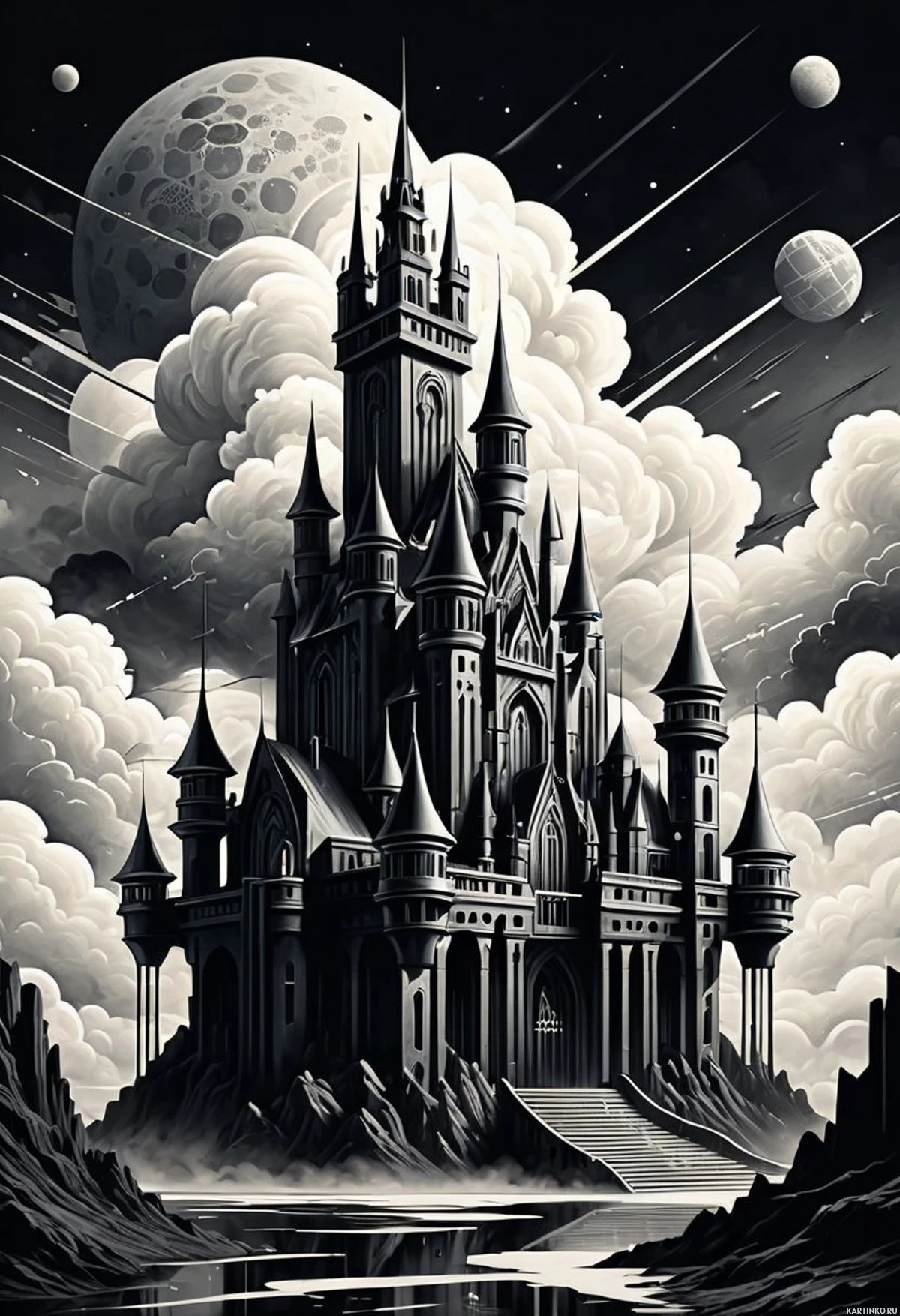 an entrance door at the base of the castle, which is partially open, inviting entry. The castle itself has intricate architectural details, suggesting a medieval fantasy theme. There are no visible people or animals in the image, and the style of the artwork leans towards realism with fantastical elements.