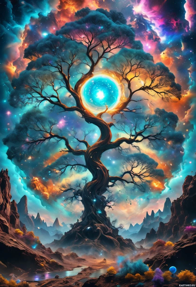 central sphere are various elements such as clouds, rainbow-colored energy streams, and other mystical motifs that contribute to a dreamlike or magical atmosphere. The tree's roots extend deep into the earth below, suggesting strength and vitality. In the background, there is a landscape with jagged mountains and a clear