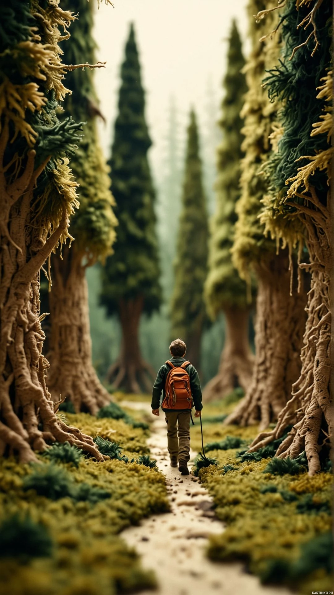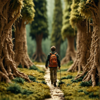 a young man journeying through an enchanting forest. He is seen from behind, walking away from the viewer along a path that seems to be etched into the ground between the thick trunks of trees with