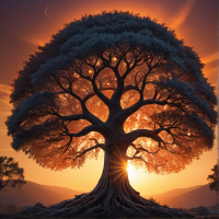 green leaves. At the heart of the tree is a radiant sunburst, symbolizing vitality or perhaps being