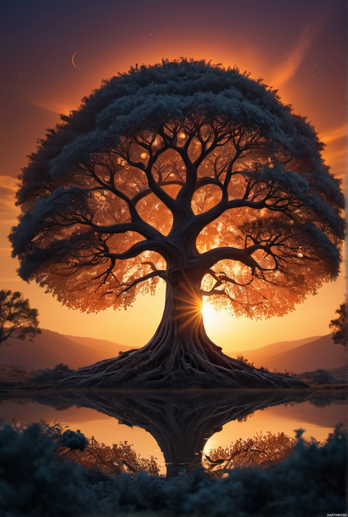 warm hues, suggesting either dawn or dusk. The tree stands on a small island at the center of what appears to be a serene
