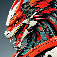 advanced technology, featuring mechanical components that resemble gears and wires integrated into its skull. The overall color scheme is primarily red, black, and white, emphasizing the fiery and intimidating nature of the dragon, while also highlighting the metallic and technological aspects of