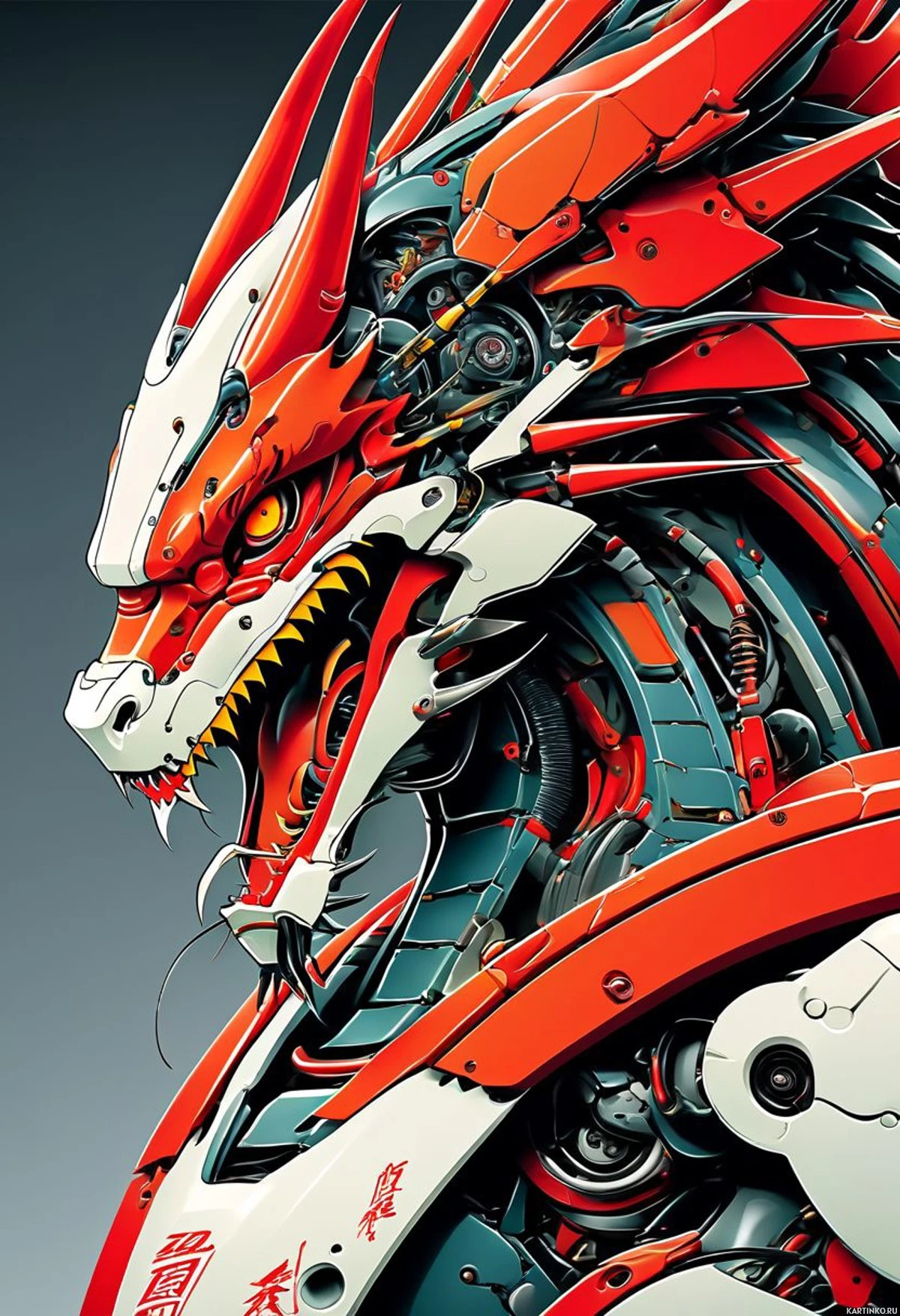 a fantastical creature that appears to be a fusion of a dragon and a robot. It has the head and wings of a dragon with red,