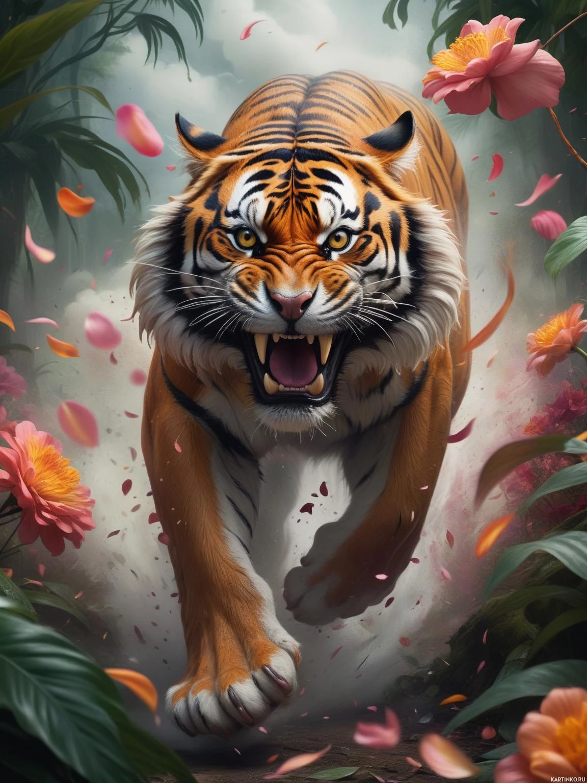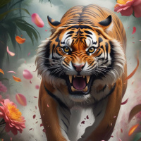 forest setting, which includes various trees with lush foliage, bushes, and flowers. The overall atmosphere of the picture suggests a natural, wild environment where the tiger would be found in its