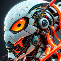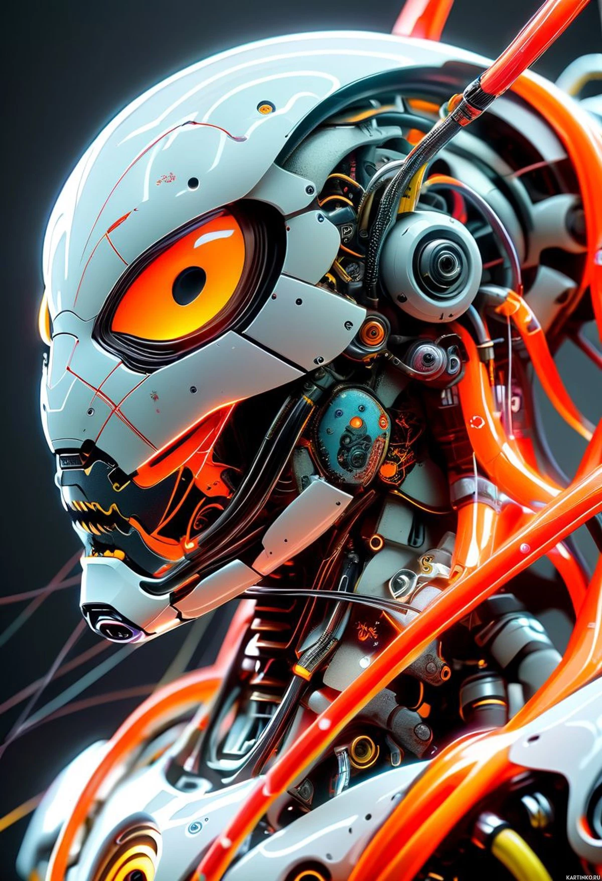 a humanoid form, featuring mechanical and organic elements. It has an orange and black face with glowing