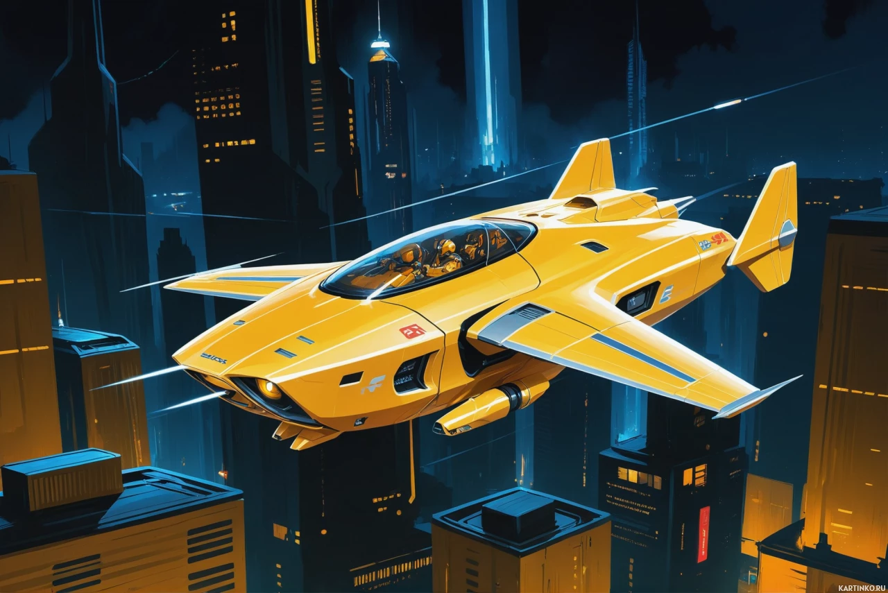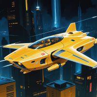 a science fiction or cyberpunk setting. The jet has a vibrant yellow and black color scheme, with intricate details suggesting