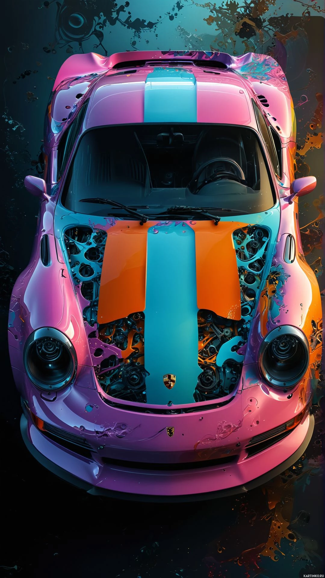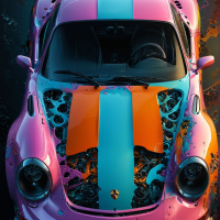 vibrant designs painted on it, including a large number "91" in the center of the front hood. There are also splatters or droplets that give the impression of paint being thrown onto the car. The wheels have additional decorations, with what appears to be