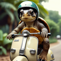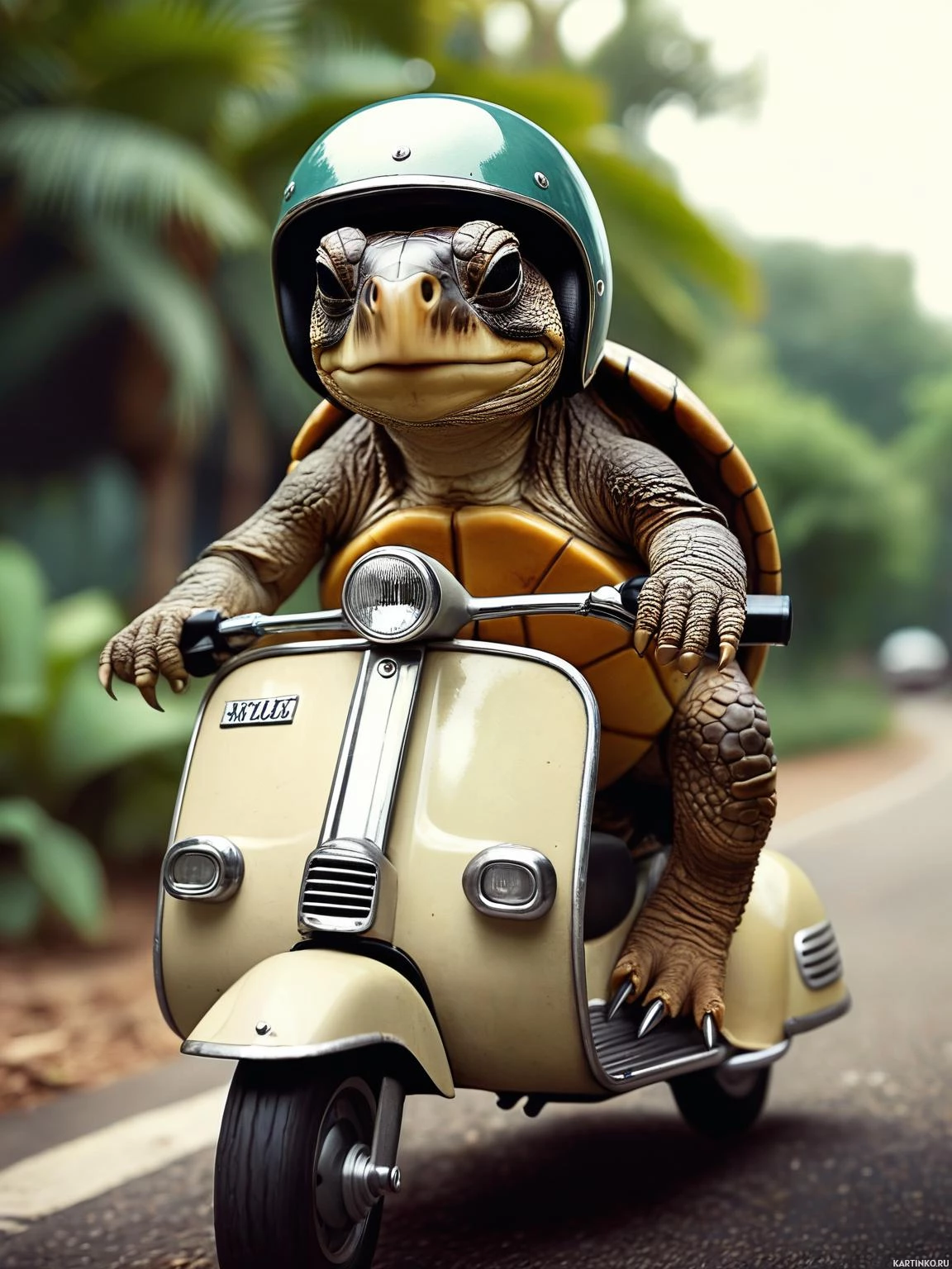The image features a turtle wearing a motorcycle helmet and riding on the back of a scooter. The setting appears to be an outdoor area with palm trees, suggesting a tropical environment. The turtle is anthropomorphized, meaning it has been given human characteristics in this artistic portrayal.