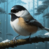 forest scene. The bird is detailed with various shades of brown and gray, typical for a titmouse. The background features a serene