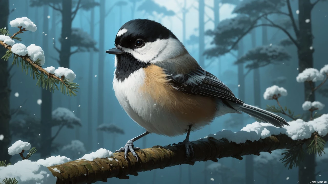 The image depicts a small bird perched on a thin branch amidst a snowy