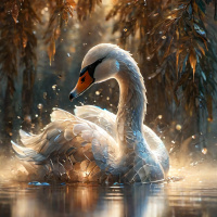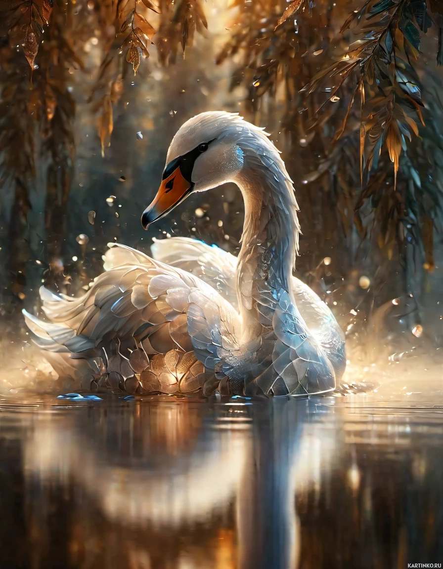 a majestic swan, its feathers shimmering in hues of white and cream. The bird is gracefully perched on what appears to be a branch or fallen log, situated within the heart of