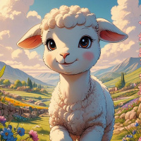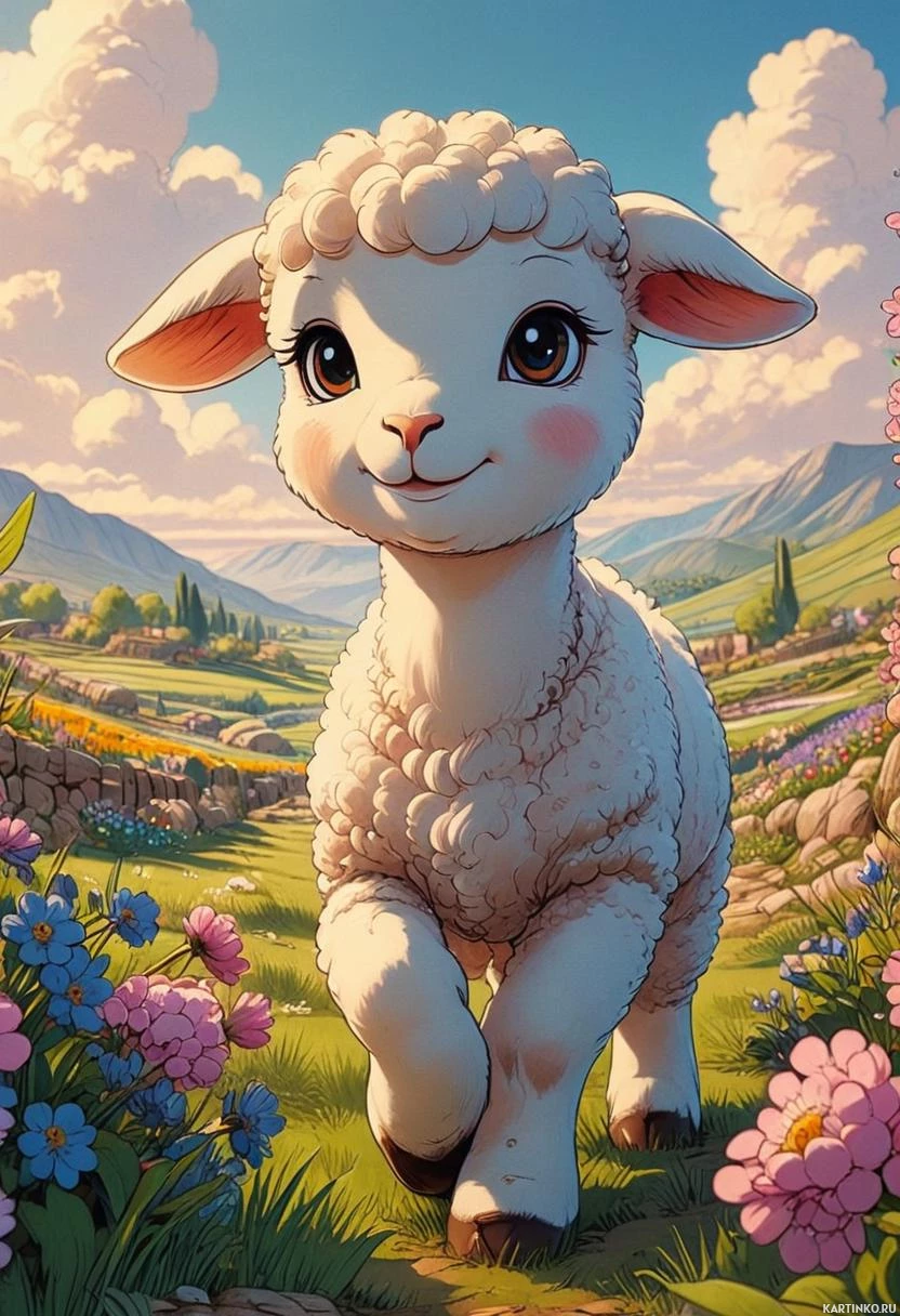a baby sheep, often referred to as a lamb. It is depicted in mid-run, with one leg raised and its tail flicking. The lamb has a fluffy