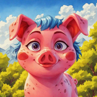 white cloud. The background gives off a serene and vibrant atmosphere that contrasts with the whimsical character in the foreground. The overall style of the image suggests it could be from a children's book or an animated show, given the stylized features and cheerful expression on the pig's face.