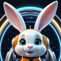 floppy ears characteristic of a bunny and is wearing headphones with a microphone attached. It appears to be sitting in the pilot's seat of some sort of spacecraft or space station, as indicated by the presence of