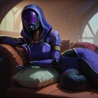 purple armor with a mask that has a visor, which is typical of her appearance within the game.