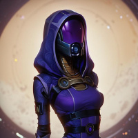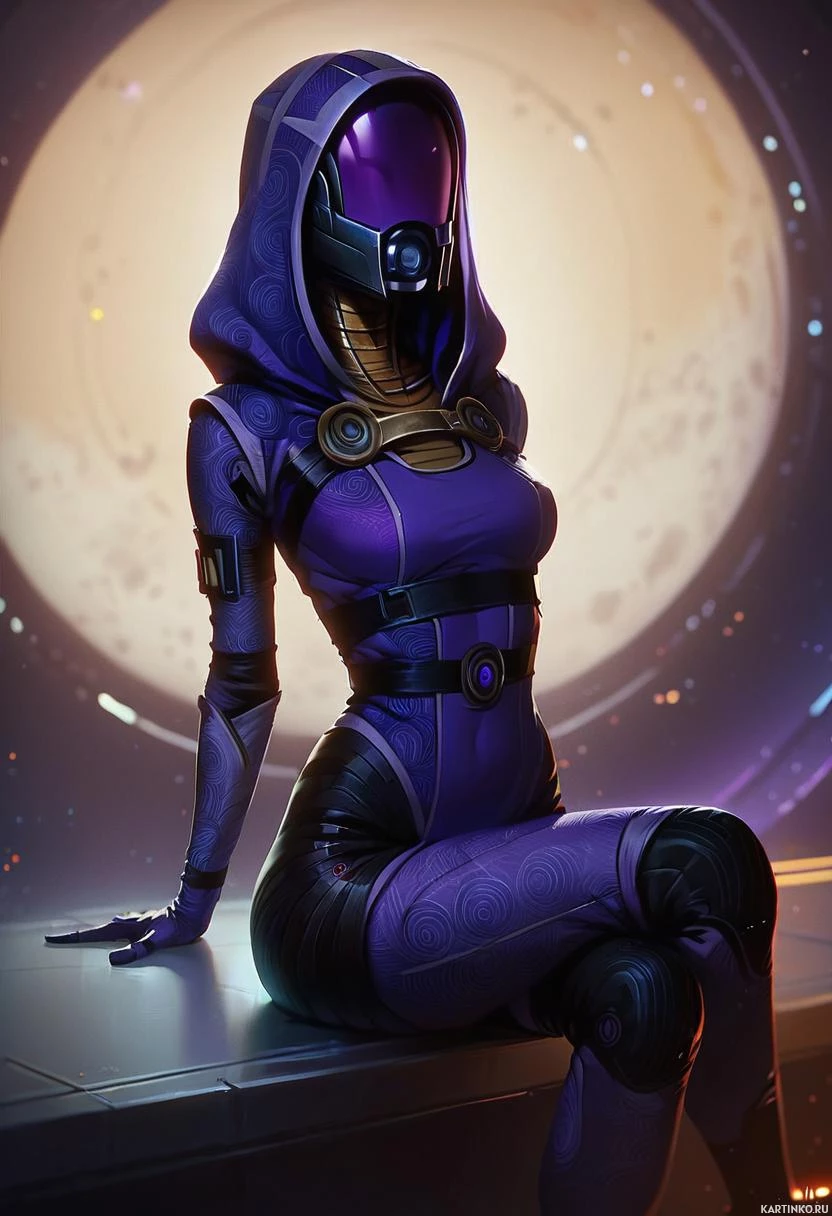 The image features a character from the video game "Mass Effect" named Tali. She is depicted in her default appearance, wearing her signature purple outfit with a helmet and visor that conceals her face, which are iconic elements of her design within the game series.