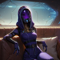 На картинке — трехмерная визуализация Тали из серии игр Mass Effect. На ней её знаменитый фиолетовый и черный костюм, включающий шлем с визором. Поза говорит о том, что она отдыхает или делает перерыв.