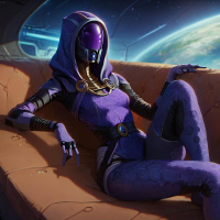 game series. This character is Tali, known for her purple and black armor, which is depicted here in a stylized manner. She is sitting on a couch with