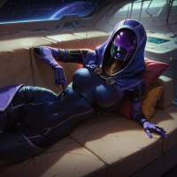 The image features a digital artwork of a female character, known as Tali from the video game "Mass Effect." She is depicted in a relaxed pose on what appears to be the cockpit chair of a spaceship. The character is wearing a sleek purple and black bodysuit with intricate details that are characteristic of the game's futuristic aesthetic.