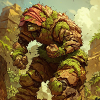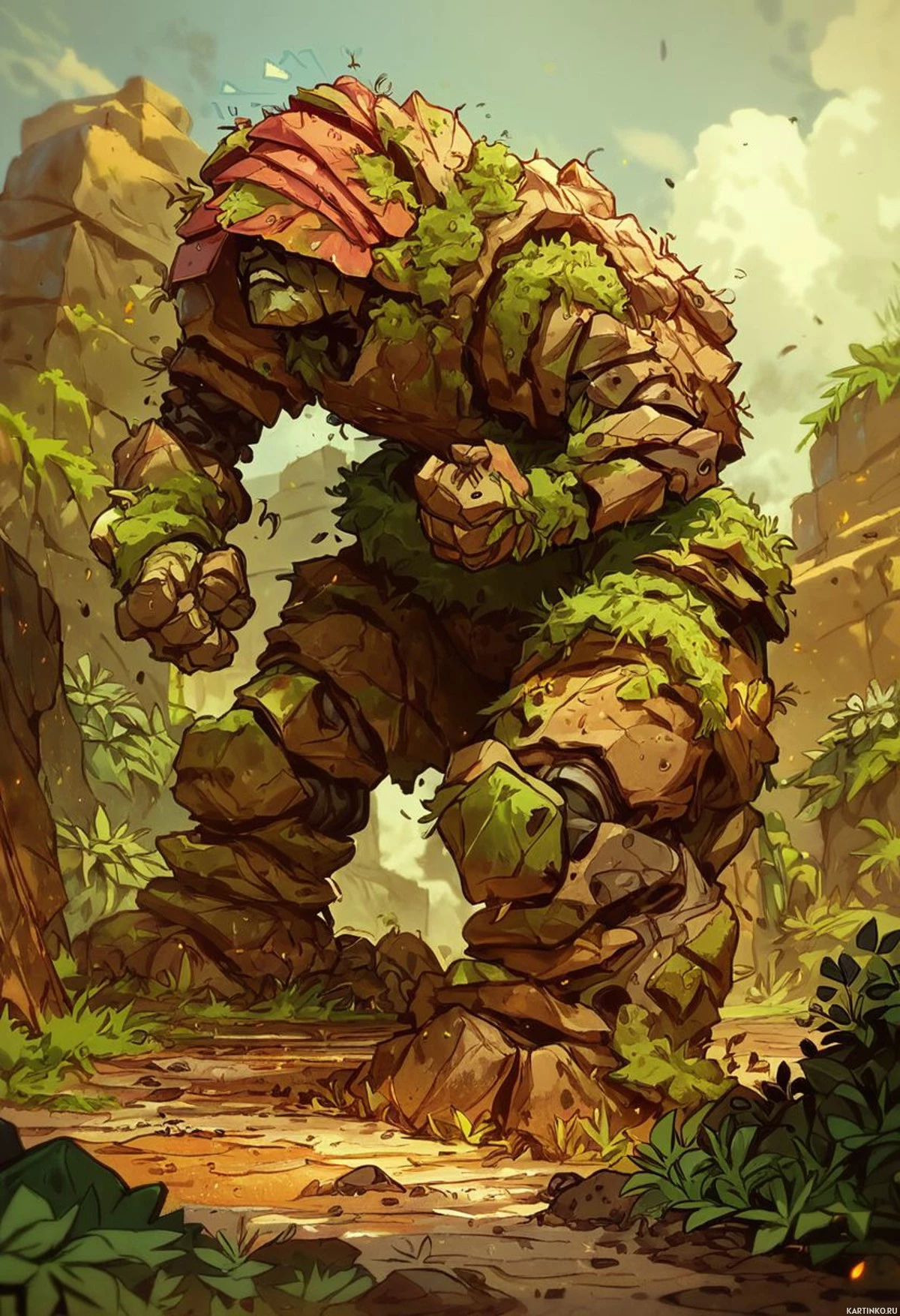 a fantasy setting. The golem appears to be made of stone or a similar material and has a large,