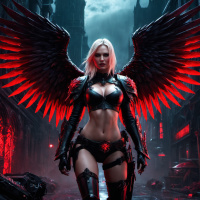In this image, there is a female character with white hair and red wings. She appears to be dressed in armor that seems to have fantasy or sci-fi elements, such as spikes and metallic details. The setting looks like an urban alleyway at night, with glowing lights and vehicles hinting at a futuristic or alternate reality. The overall tone of the image is dark with a touch of brightness from the illuminated signs.