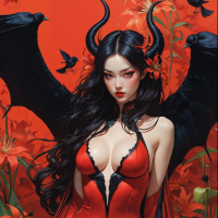 a female character with long black hair and horns, which are commonly associated with depictions of succubi in mythology. She has