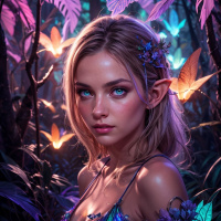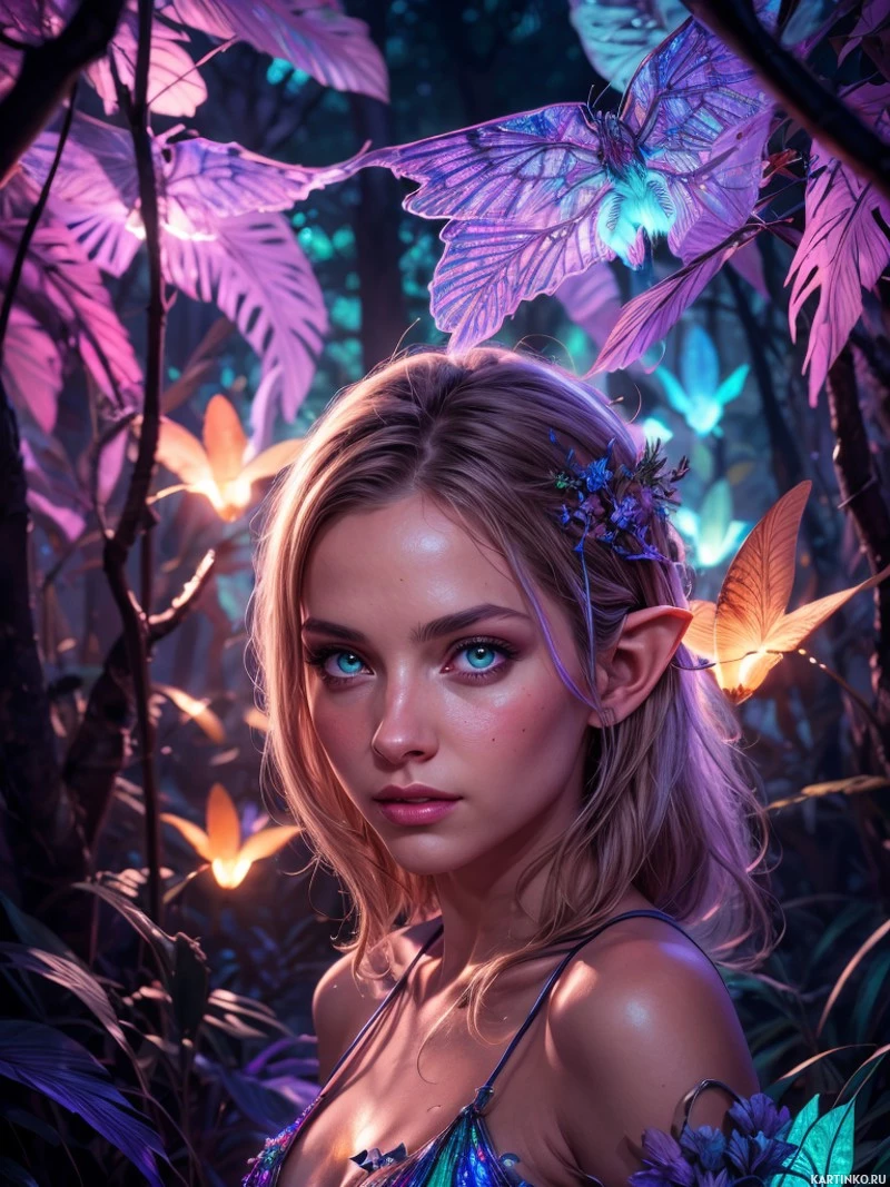 vibrant flora that appear to be magical or otherworldly in nature, with leaves in various shades of green, pink, and blue. There are also butterflies present in the image, which add to