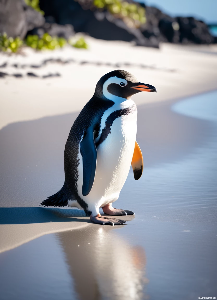 a coastal environment. The colors in the photo are quite naturalistic, with the penguin's black and white plumage standing out against the sandy beach tones.