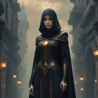 medieval attire that includes a long, flowing cloak and a hood that conceals her face. She wears