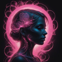 dark hair and is wearing what appears to be an armor or a helmet with decorative elements that resemble feathers. There are pink and purple magical effects emanating from her head, suggesting either the release of energy or