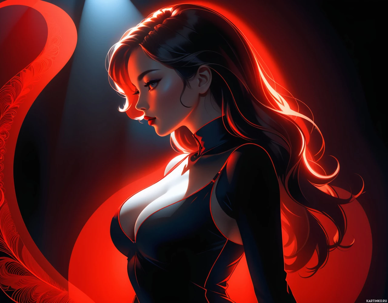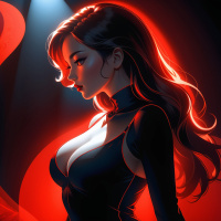 a black outfit that appears to be designed in a gothic or futuristic style, with elements like corsets, straps, and a high collar. Her attire includes intricate details and accessories, such as buckles, chains, and a brooch on her shoulder. The lighting is dramatic, with the character being lit from below, creating a halo effect around her head that casts an upward shadow, suggesting she might be standing near or within