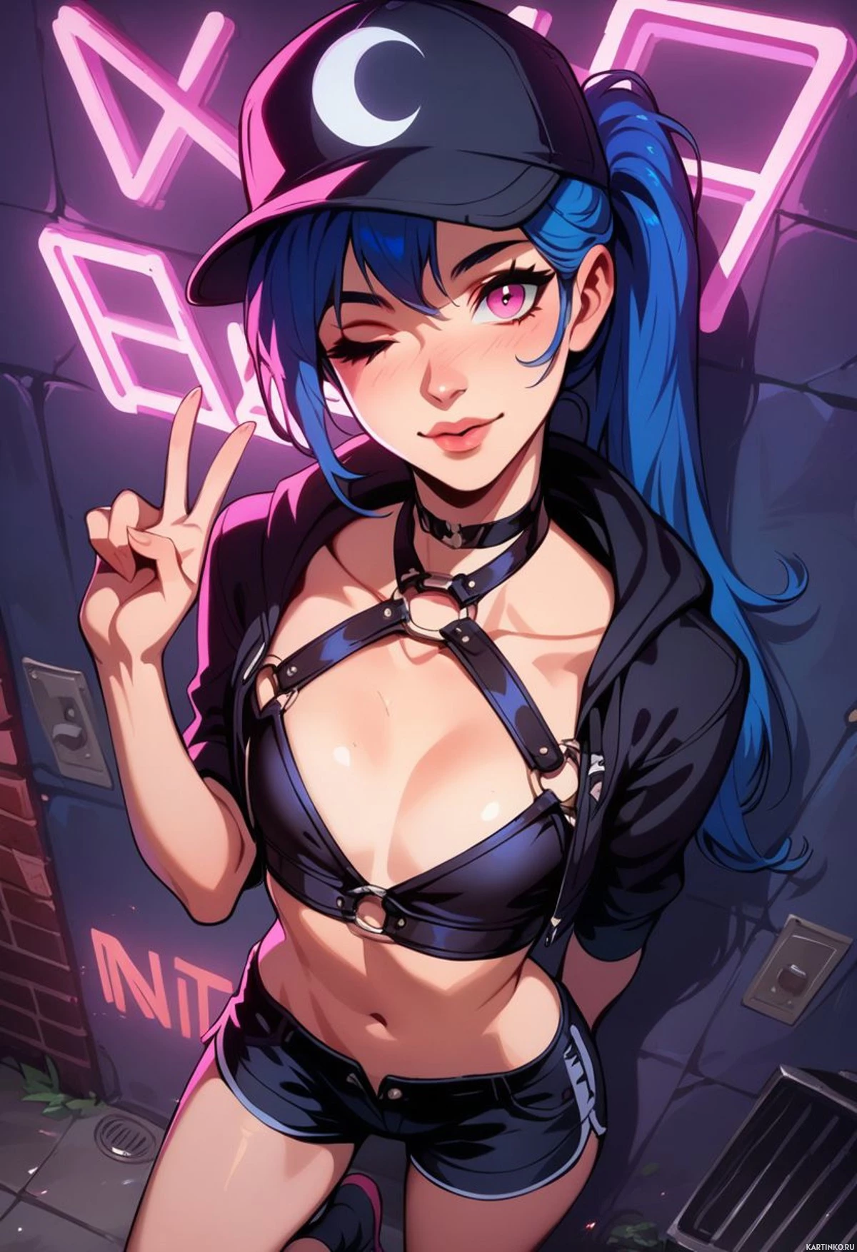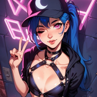 sign gesture. The overall style of the image leans towards a contemporary and edgy aesthetic, commonly associated with anime-inspired or streetwear fashion.