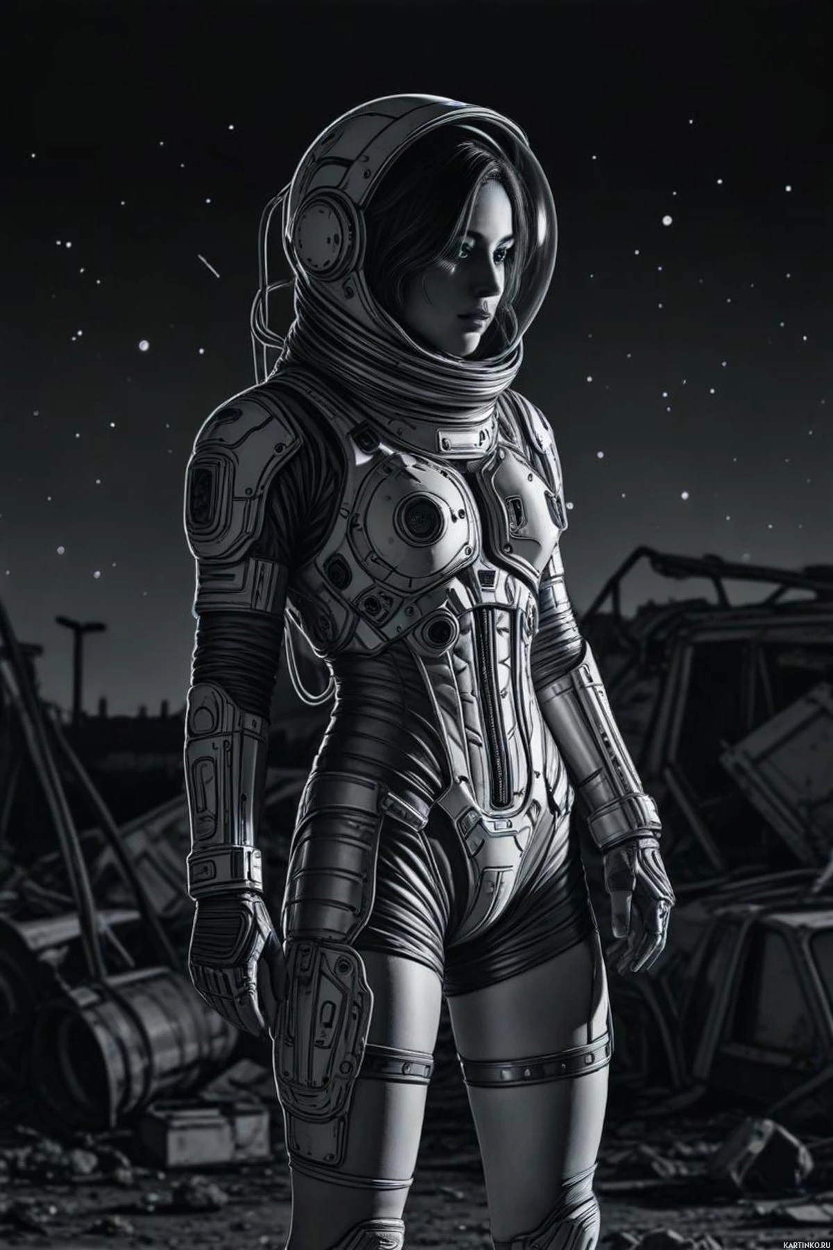 night sky, implying a extraterrestrial setting. There are craters and debris scattered around the area, indicating that it may be
