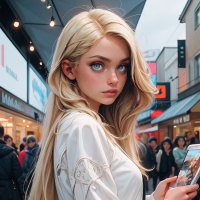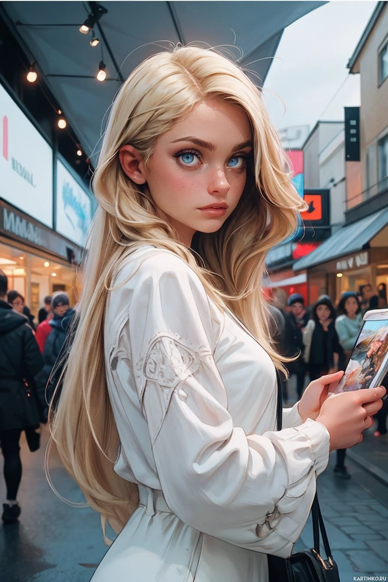 a young woman with long, wavy blonde hair and blue eyes. She has