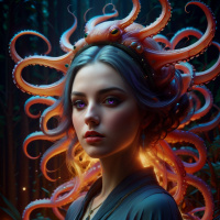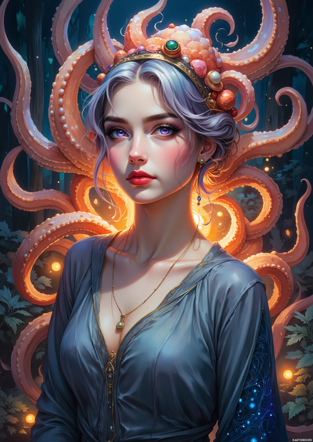 a female character with turquoise hair, adorned with an elaborate headpiece that incorporates an octopus motif. She has
