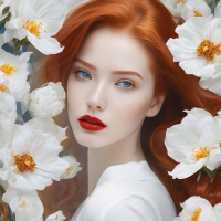 white flowers with yellow centers, creating a soft, floral backdrop. The art style suggests it could be a digitally enhanced photograph or a painting designed to showcase the beauty of the subject against an aesthetically pleasing background.