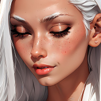 prominent eyeliner and what appears to be a subtle highlight or contouring around her eyes and cheeks. Her expression is neutral with