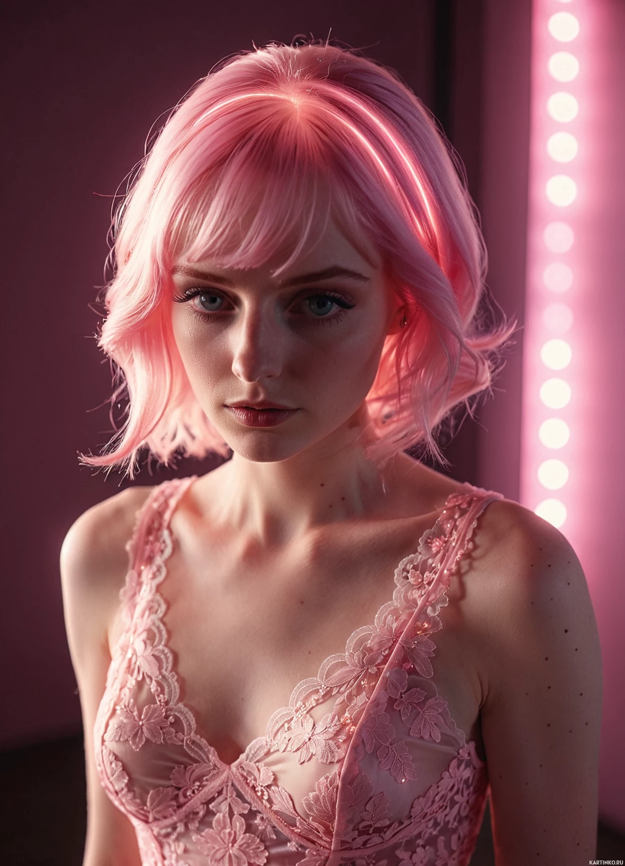 На картинке запечатлена молодая женщина с короткой розовой стрижкой и макияжем, подчеркивающим черты лица. У неё нейтральное выражение лица, и она смотрит прямо в камеру. На ней розовый топ с кружевной отделкой на шее. На заднем плане видны вертикальные неоновые огни, что говорит о помещении с современной системой освещения. Стиль картинки напоминает модный портрет, возможно, созданный для модельного профиля или рекламы, судя по его лаконичности и элегантности.