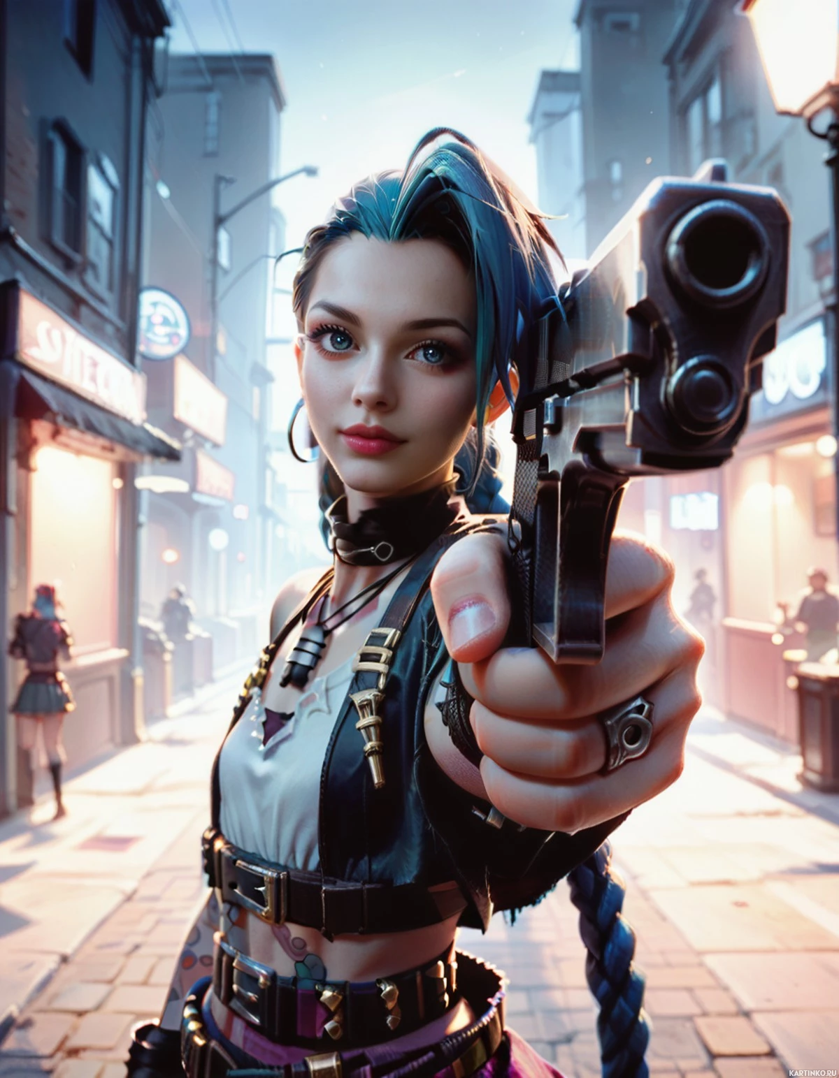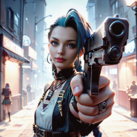 blue hair and is wearing a black leather jacket with a choker-style necklace around her neck. In one hand, she is holding a pistol, pointing it forward as if aiming at something or someone not in the frame of the picture. The background suggests