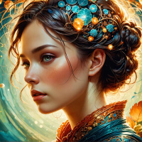 golden ornaments scattered around her head and shoulders, which could be interpreted as magical elements or part of her character's attire. The overall style of the image suggests it might be related to fantasy art or digital illustration, commonly associated with science fiction or fantasy genres.