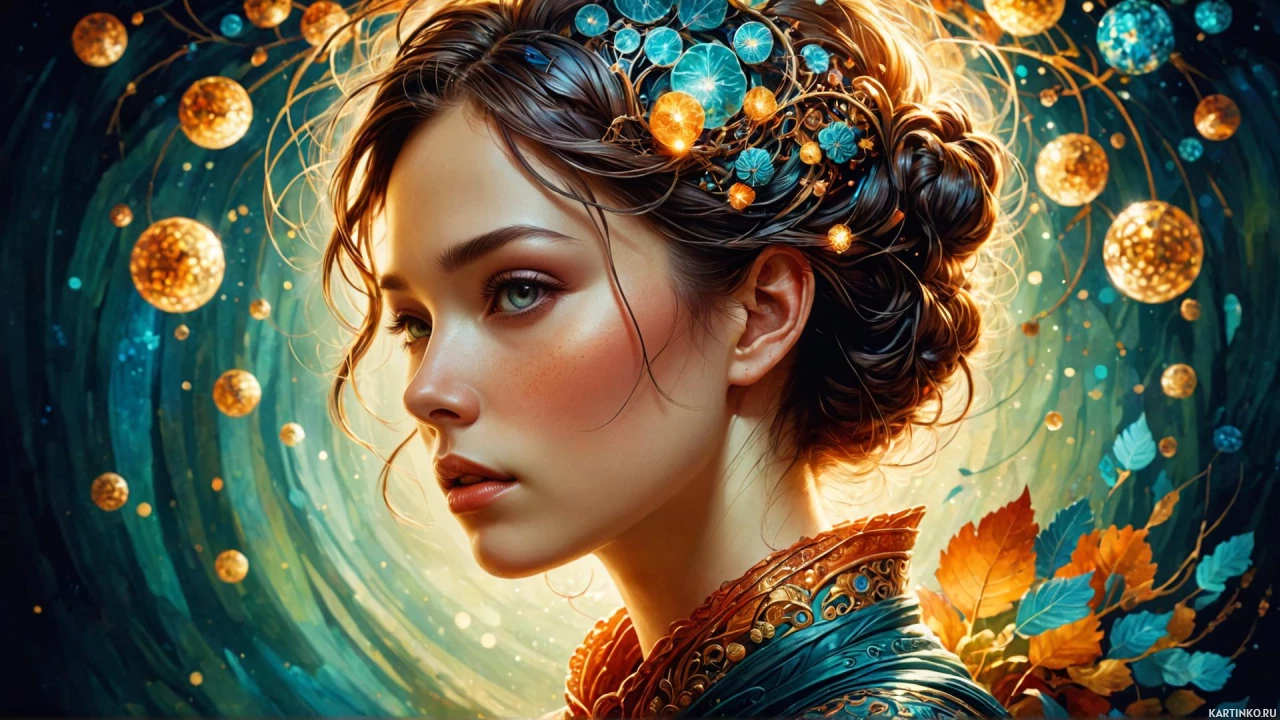 blue color that adds to the ethereal quality of the portrait. The background is vibrant with blues and greens, enhancing