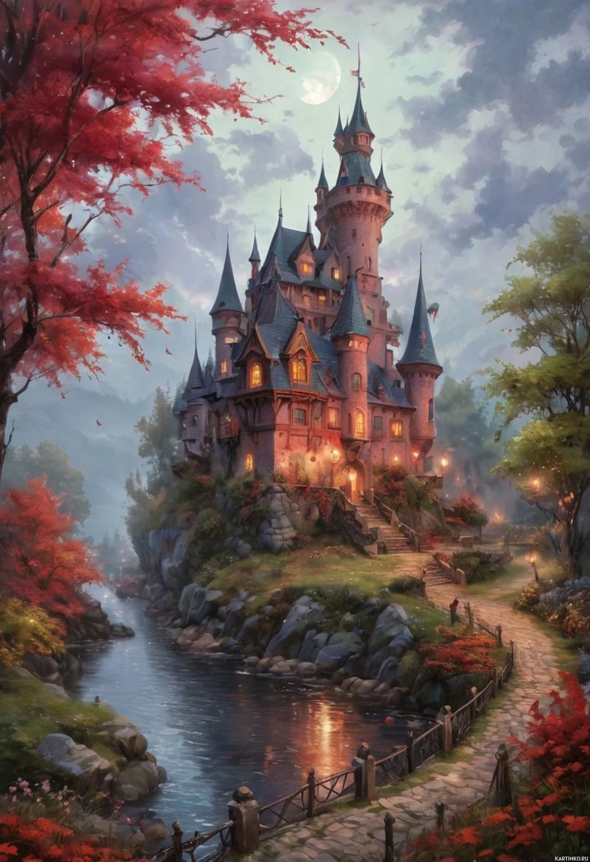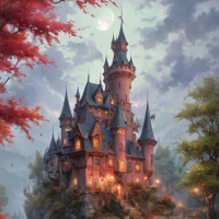 a picturesque scene with a fairy tale-style castle as the central focus. The castle is perched on