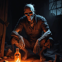 eye sockets and a missing nose. It is wearing a faded, dark-colored shirt that resembles burlap or a sackcloth. The zombie is holding a lantern in its right hand, which has a lit wick casting