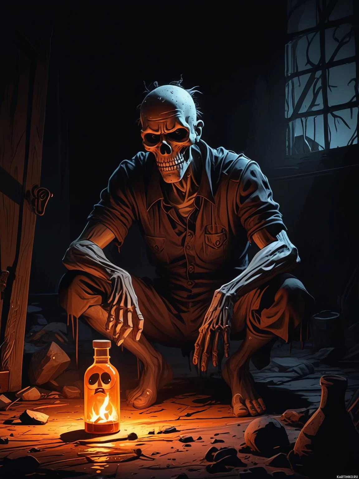In the image, a zombie is depicted crouching on the ground. The zombie's skin appears decayed, and it has a skull-like face with empty