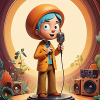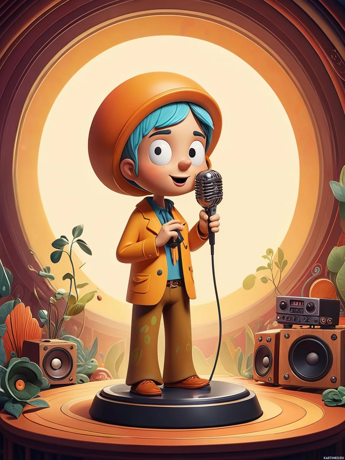 natural light filtering through what looks like tree foliage around the edges of the picture. In his right hand, he is holding a microphone. To his left, there are old-fashioned portable stereo speakers. The overall scene suggests that the character might be preparing to perform or broadcast something.