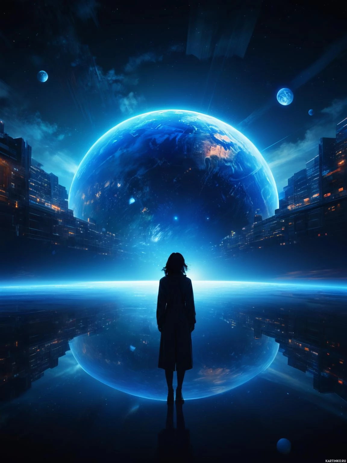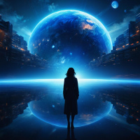 a silhouette of a girl standing on what appears to be a reflective surface or water. She is facing away from the viewer and looking up towards a large globe that resembles Earth, with oceans visible on its surface. The globe is suspended in mid-air above her head. The setting seems to be