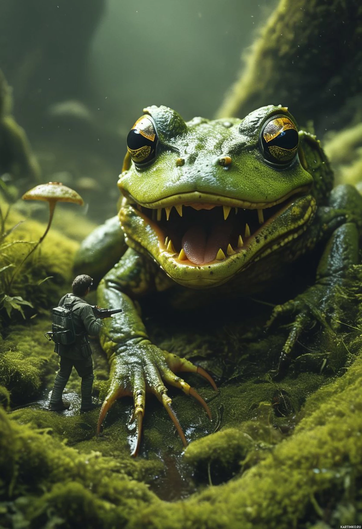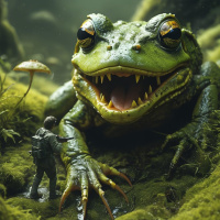 a fantastical scene featuring an oversized, anthropomorphic frog monster with sharp teeth and glowing yellow eyes. It's sitting on the ground in a forest-like setting, surrounded by smaller mushrooms. To the left of the giant frog is